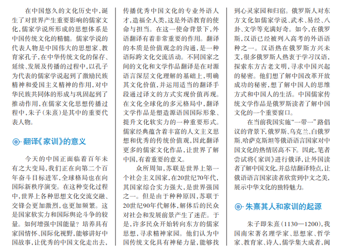 中国传统经典文学作品 是中华文化的精髓,将代表中 华文明的经典作品翻译成俄 语,让俄语国家的读者了解中 国传统文学作品,讲好中国故 事,表达中国声音,是外语人 的使命和责任。儒家学说在 中华传统文化的保存、延续、 发展并且传播的过程中,起到 了重要作用。朱熹是儒家学 说的重要代表人物。
