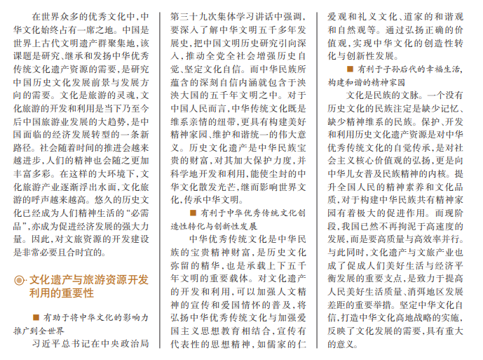 在世界众多的优秀文化中,中 华文化始终占有一席之地。中国是 世界上古代文明遗产群聚集地,该 课题是研究、继承和发扬中华优秀 传统文化遗产资源的需要,是研究 中国历史文化发展前景与发展方 向的需要。文化是旅游的灵魂,文 化旅游的开发和利用是当下乃至今 后中国旅游业发展的大趋势,是中 国面临的经济发展转型的一条新 路径。社会随着时间的推进会越来 越进步,人们的精神也会随之更加 丰富多彩。在这样的大环境下,文 化旅游产业逐渐浮出水面,文化旅 游的呼声越来越高。悠久的历史文 化已经成为人们精神生活的“必需 品”,亦成为促进经济发展的强大力 量。因此,对文旅资源的开发建设 是非常必要且合时宜的。