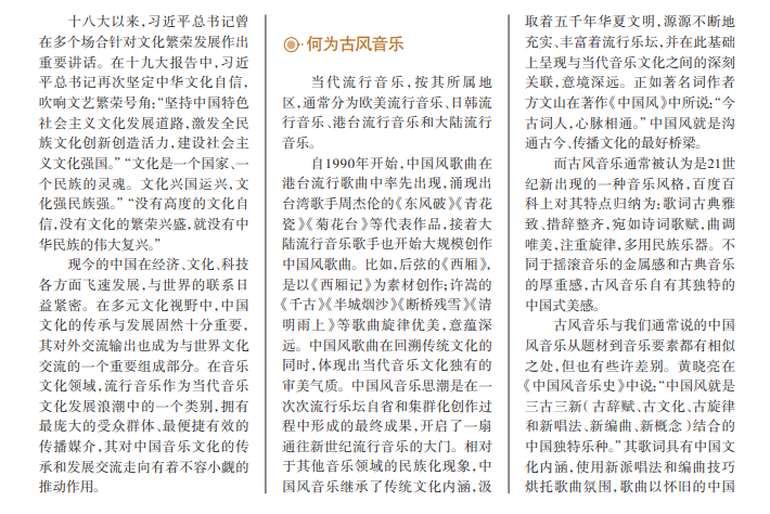 “古风音乐”作为21世 纪初新兴的网络流行音乐形 式,在近几年迅速发展起来。 古风音乐发展对中国传统文 化中的传统文学、传统服饰 复兴起到了积极的推动作 用,对全民审美素养的提高 和民族音乐文化认同、树立 文化自信、弘扬与传承中国 民族精神,也有着不可小觑 的促进作用。