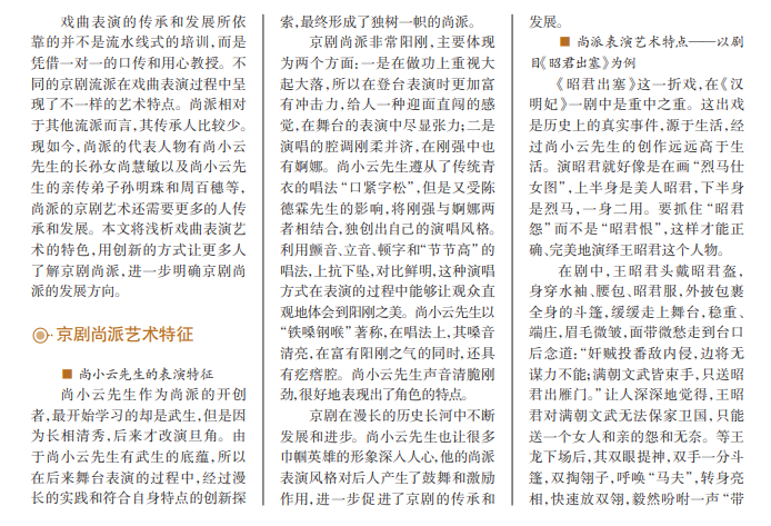 戏曲表演艺术是我国 民族文化的瑰宝,从京剧 发展历程中可以看出我国 戏曲悠久的历史传承。京 剧在传承的过程中会因为 传承者自身的生活环境和 人生阅历,对演绎的人物 不同的情感把握,呈现不 同的演唱风格。尚小云先 生是京剧艺术的代表人 物,与梅兰芳、荀慧生、程 砚秋并称为“四大名旦”。 尚派的演唱风格为京剧旦 角艺术的发展增添了浓墨 重彩的一笔。