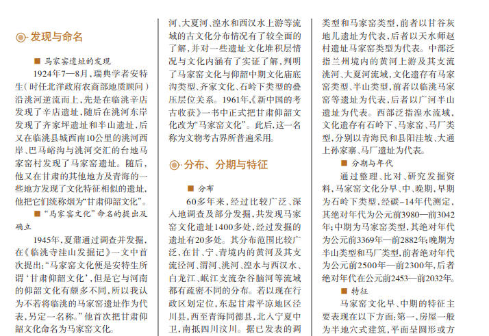 马家窑文化是黄河上游新石器时代 晚期文化,1924年发现于甘肃省临洮县洮 阳镇马家窑村的马家窑遗址,故名马家窑 文化。笔者近期搜集、整理马家窑文化的 相关资料发现,散见于网络、政府文件、有 关论文等材料的内容零散且不统一。为 了让大众对该文化有一个更为明确、系统 的了解,笔者翻阅大量资料,多方查证,将 比较权威的观点等资料加以整理、汇总、 概括,形成文稿。