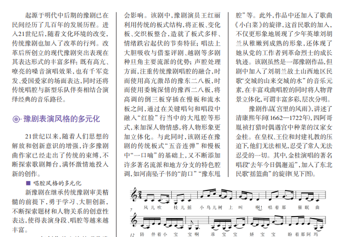 随着时代发展,现代豫剧在内 涵表达、具体形态与风格方面,都展 示出与传统豫剧显然不同的特征, 表演身段、唱腔、舞美艺术更加丰富 多彩,题材广泛、人物风格多样、表 现技法新颖也纳入了更多的传播渠 道和技术支持,在创作方面拥有了 更多的空间。现代豫剧在继承传统 豫剧审美精髓的前提下大胆创新, 深入探索故事题材和人物关系,进 行更深层次的创意性表达,使豫剧 艺术形成了表演多元、多样化的时 代风格特点。