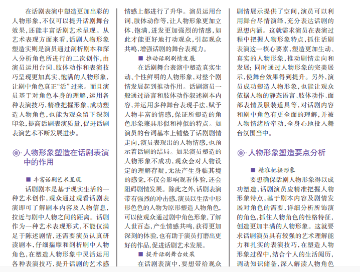 话剧在我国有着悠久的历史,是 中华文化不可或缺的重要组成部分。 尤其在进入现代社会后,国民经济水 平有所提高,话剧艺术也得到了繁荣 发展。在话剧表演中,如何塑造更加 生动的人物形象对话剧演出至关重 要,需要演员深刻剖析剧本,钻研人物 形象,使剧中人物更加真实饱满,展现 话剧的艺术魅力,为观众带来绝佳的 视觉盛宴。