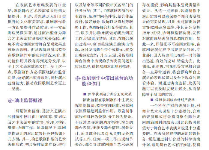 随着人民群众物 质生活日益富足,他们 的精神文化需求和艺 术审美意愿空前高涨。 近几年,歌剧舞台作品 受到大众的高度青睐。 但是,在歌剧制作过程 中,不得不考虑舞台表 演规模、艺术专业性以 及舞台协调组织等问 题,如此便需要发挥演 出监督的作用。