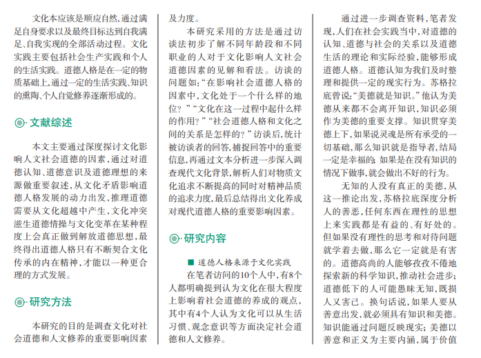 人类文化实践的凝结主要来 源于人格修养中的道德精神,文化 实践在以道德认知、意志和理想为 基础的情况下不断发展壮大。当 文化超越了道德底线,就会和道德 情感发生冲突,文化矛盾是促进道 德人格发展的因素之一。文化理 性在不断加强人们文化修养的同 时,通过道德人格来进行标准评 价。在现代飞速发展的文化经济 社会,人们对文化的要求越来越 高。人格素养应该以本土文化为 立场,通过有效的文化塑形等方式 深入了解文化的精神世界。