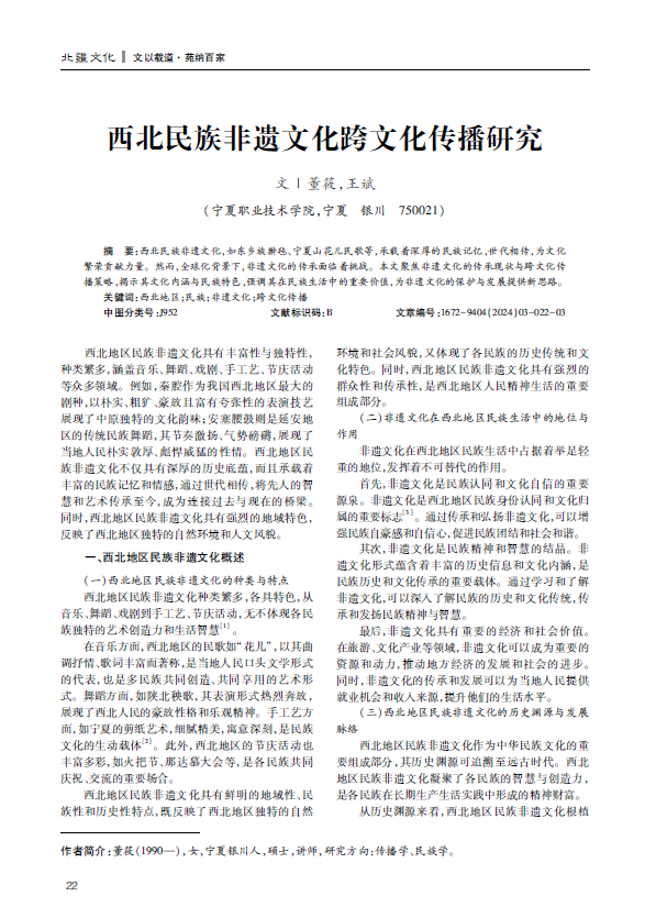 西北民族非遗文化,如东乡族擀毡、宁夏山花儿民歌等,承载着深厚的民族记忆,世代相传,为文化繁荣贡献力量。然而,全球化背景下,非遗文化的传承面临着挑战。本文聚焦非遗文化的传承现状与跨文化传播策略,揭示其文化内涵与民族特色,强调其在民族生活中的重要价值,为非遗文化的保护与发展提供新思路。