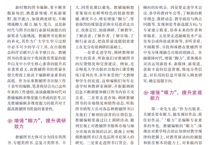 目前,广大图书编辑已充分认 识到多维度能力养成对自我成长 与提升图书品质的关键性作用。作 为教材的补充,教辅图书的质量对 我国教育质量的提升与中小学生 核心素养的提升具有重要意义。而 教辅图书的质量在很大程度上取 决于编辑职业素养的高低。在融媒 体时代背景下,提升教辅编辑的职 业素养就是要在图书策划实践中 不断注重养成多维度能力,全面构 建出版工作需要的能力结构。