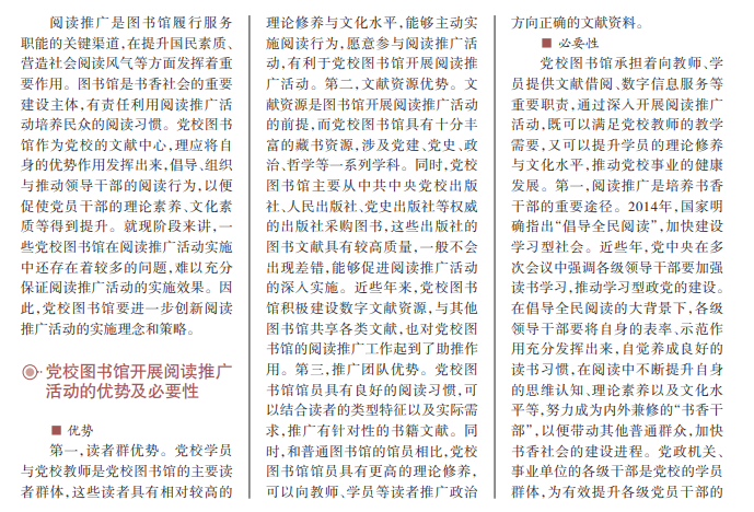 阅读推广是党校图书馆的 一项重要工作,科学开展阅读 推广活动,既可以促进图书馆 的转型发展,又可以推动书香 干部的培养。近些年来,党校 图书馆虽然充分重视阅读推广 工作,但在具体实施中还面临 着形式单一、人才缺乏等问题, 导致阅读推广活动的预期目标 难以实现,影响到党校图书馆 服务职能的发挥。面对这种情 况,党校图书馆要进一步提升 思想认识,创新阅读推广活动 的实施策略,完善相关保障机 制,切实提升党校图书馆的阅 读推广工作水平。