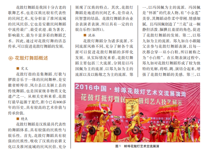 花鼓灯舞蹈是一种较 为独特的艺术体系,展现了 淮河流域的特色。加强花鼓 灯舞蹈的活态传承与发展, 不仅可以促进传统文化的发 展,也可以增强国家的文化 软实力。