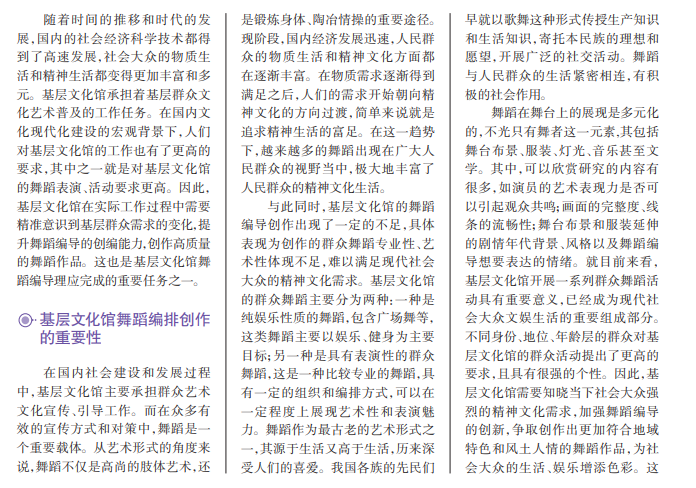 近年来,国内社会经济 和科学技术高速发展,全民综 合素养得到较大的提升,人们 对精神文化有了较高的要求。 舞蹈是广大群众所喜爱的艺 术形式,也是基层文化馆展示 自身底蕴、普及群众文化艺术 的重要载体。目前来看,群众 对基层文化馆的舞蹈表演、活 动要求都在不断提升。在这 种情况下,基层文化馆需要提 升舞蹈编导创作能力,创作真 正符合基层群众需求的高质 量舞蹈作品。