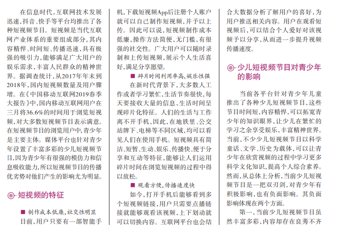 短视频是新媒体时代的 产物,其基本特征是时间短、制 作成本低、操作便捷、传播速度 快,因此备受推广。目前,各平 台针对中国青少年推出了大量 的少儿短视频节目,深受青少 年的喜爱。短视频节目拓宽了 青少年的知识眼界,有助于提 高他们的文化素养。然而,不 可忽视的是,短视频占用了青 少年不少的学习时间和精力。