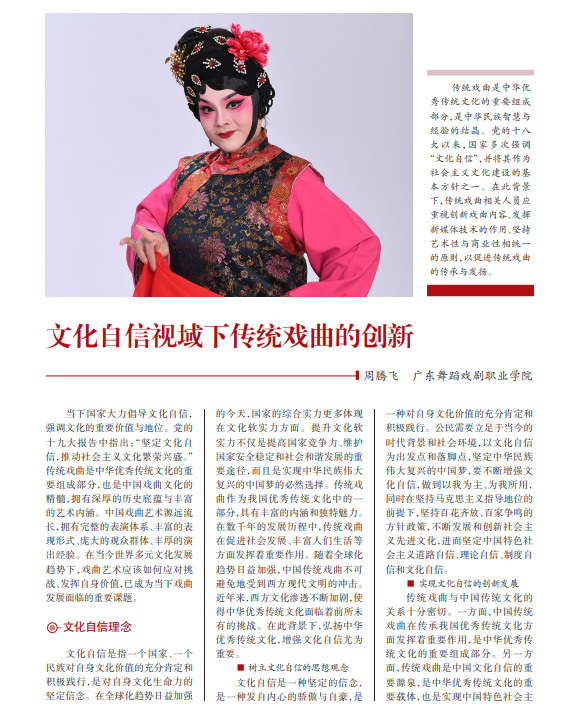 传统戏曲是中华优 秀传统文化的重要组成 部分,是中华民族智慧与 经验的结晶。党的十八 大以来,国家多次强调 “文化自信”,并将其作为 社会主义文化建设的基 本方针之一。在此背景 下,传统戏曲相关人员应 重视创新戏曲内容、发挥 新媒体技术的作用、坚持 艺术性与商业性相统一 的原则,以促进传统戏曲 的传承与发扬。
