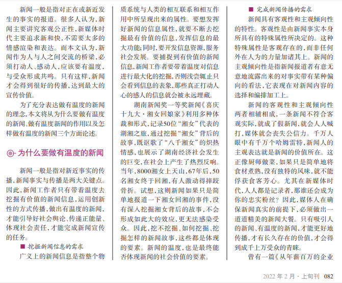 新媒体时代对新闻宣传提出 了全新的要求,传统媒体人在面 对新变化、新要求时常感到无所 适从,新闻该如何创新,值得思考。 不管环境如何变化、技术如何革 新,新闻求新求变始终要以内容为 王。而做有温度的新闻,是创新的 关键,也是竞争的利器。