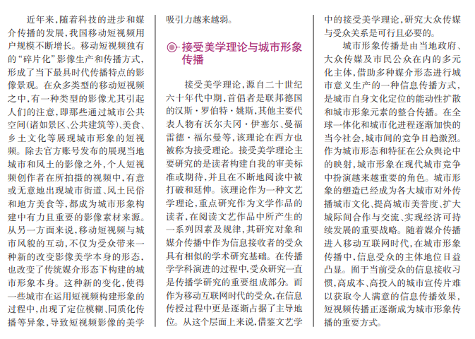 随着媒介技术的发展, 短视频成为城市形象构建传 播的重要载体。短视频在为 城市形象传播带来巨大流量 和关注度的同时,使得城市形 象传播产生了一些美学异象。