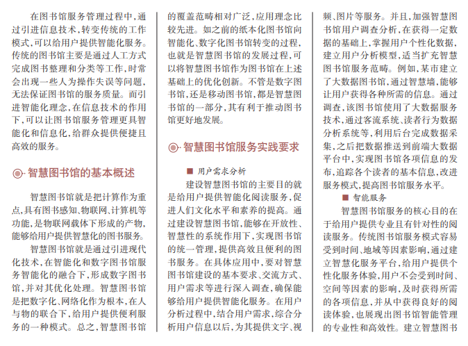近几年,我国社会经济 发展水平持续升高,信息技 术得到了稳定发展,让人们 的生活与工作方式发生了重 大改变。图书馆在社会建设 发展中发挥着重要作用,应 和社会发展目标高度统一, 迎合时代发展要求,提高管 理水平和服务质量。