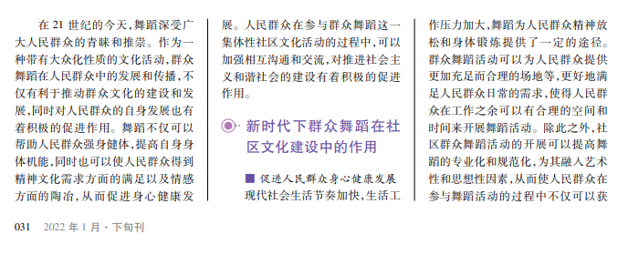 群众舞蹈是近些年来人们在物质生活越来越好的基础上逐渐形成的一种舞蹈活动,具有非常广泛的群众基础。现代社区理念并不仅仅是居民单纯意义上的生活聚集,还承载着社区文化等内容。群众舞蹈对社区文化建设有着巨大的作用,它极大地促进了和谐社区文化建设。群众舞蹈在形式多样的业余文化生活中起到了举足轻重的作用,为社区居民带来视觉上的享受,增加社区居民的情感交流,有利于群众获得身体和心理的双重效应。这种自发性的群众娱乐形式,是富有创新性的人们在社会的不断发展过程中所创造的一种艺术形式。这种舞蹈形式的独特性,是其他娱乐方式所无法代替的。同时,其发展还推动了社区文化的建设,成为社区文化建设的重要组成部分。