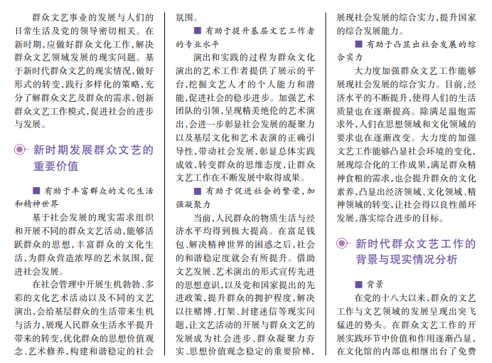 群众是社会发展进步、国家总体治理、社会管理环节的主体。群众的日常生活与文艺领域的需求应得到满足和重视。因此,群众文艺工作各环节在日常实践中应基于发展所需,不断践行多样化的策略,发展群众文艺工作才能够构建和谐社会,为群众的日常生活增添丰富的色彩。基于此,本文分析了新时期群众文艺工作发展的相关策略。