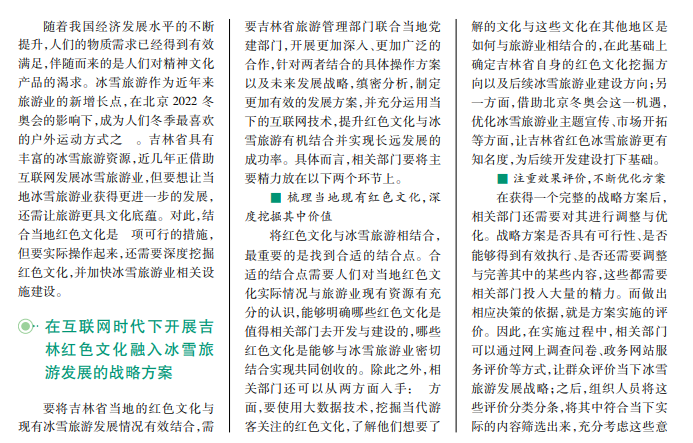 吉林省具有浓厚的红色文化底蕴,也是国内提供冰雪旅游服务的重要地区。基于这两大背景,吉林省可以考虑将红色文化与当地冰雪旅游业充分融合,在促进旅游业发展的同时,大力弘扬红色文化。本文结合当地实践,依据现有资料,分析当下吉林省如何运用互联网优势,在冰雪旅游业中融入红色文化战略,提出了围绕抗联相关红色资源设计冰雪旅游活动的方案,并认为旅游管理部门应当联合党建部门制定发展方案,实现两者的深度融合。
