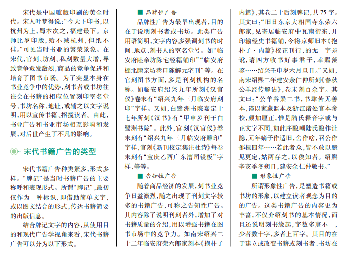 宋代商品经济发达,书业繁荣,书籍广告逐渐发展和普及。这些广告类型多样,为了进一步适应市场化的需要,初步具备了广告功能、版权功能和商标功能,对后世书籍广告产生了深远的影响。