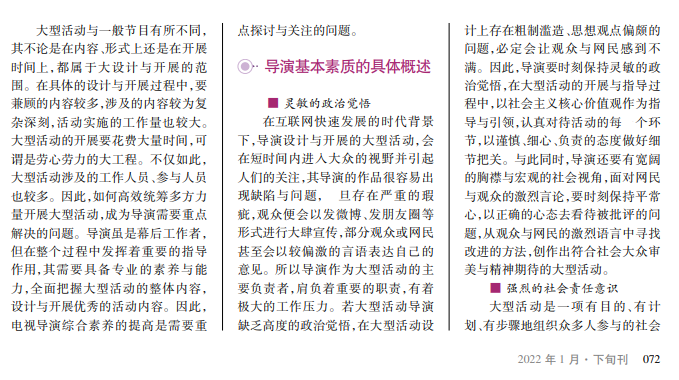 在文化事业快速发展的今天,大型活动凭借丰富多样的内容特点,吸引了社会大众的广泛关注,各式各样的文艺晚会、颁奖典礼等如雨后春笋般不断出现在人们的视野之中。大型活动的设计与开展,需要导演的科学筹划以及相关工作人员的相互协调。在大型活动中,导演扮演着重要的统筹角色,其统筹性的指导对大型活动的最终成果有着重要影响。导演的综合素质与设计水平直接决定着大型活动的最终呈现效果。