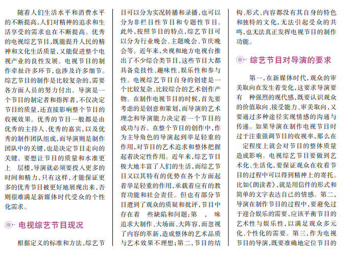近年来,随着受众的文化消费和情感表达需要的增加,大量内容丰富、形式多样的综艺节目不断出现,总体呈现出丰富性、深度性和多元性的发展特征。而在新媒体时代,作为电视综艺节目的导演,其作用不可小觑。因此,电视综艺节目的导演不仅要有独特的艺术见解,还要有良好的组织能力和综合素质。本文从电视综艺节目中的导演角色入手,分析新媒体时代的导演所需的素质与能力,及在电视综艺节目中的作用。