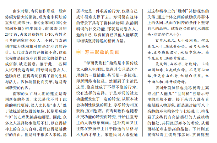 祝寿词在南宋时期出现创作热潮,其在发展过程中逐渐形成了自寿词、寿亲寿友词及寿圣寿官词三种主要类型。相比于宋亡之前多为歌舞升平、粉饰太平乃至阿谀谄媚的寿词,宋亡后遗民词人的寿词呈现新的发展趋势,着重于刻画富有才华而不仕的隐者,描摹寿主清幽的生活环境,流露出人生皆错的幻灭之感。而遗民寿词正是在祝福与赞扬之下蕴含着个体、群体与时代的悲剧。