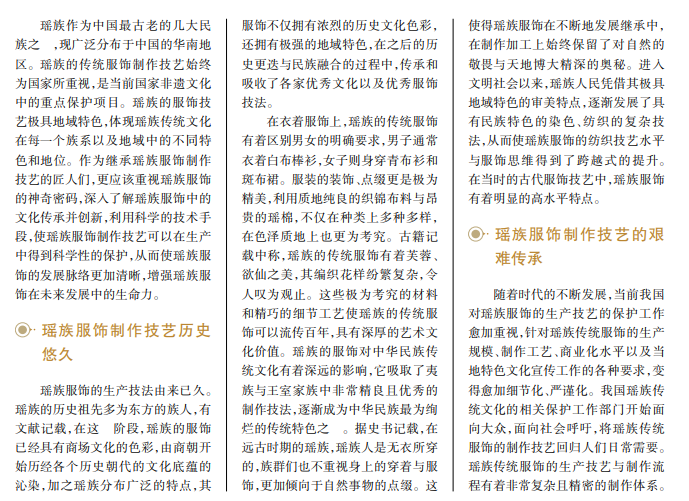瑶族的服饰制作技艺是中华民族传统服饰所流传下来的重要技法之一,体现出中华博大精深、底蕴深厚的传统服装文化。瑶族服饰精美、繁杂的服饰文化体现了古老的中华民族的神秘魅力,已于 2006年入选第一批国家级非物质文化遗产名录。瑶族服饰的制作技艺与生产性的保护措施 ,也更为文化学者和匠人所重视。