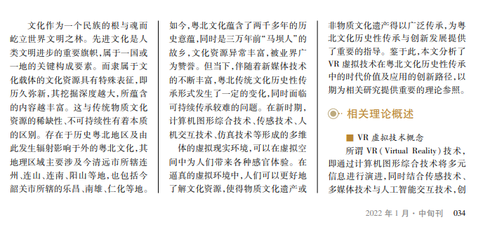 粤北文化作为一种提高民众对中华文化理解的资源,是培育社会主义核心价值观的载体之一。将VR虚拟现实技术嵌入粤北文化历史性传承中,有利于增强粤北文化历史性传承创新能力、拓展传播路径、丰富粤北文化历史性传承传播方案,具有积极的时代价值。为了更好地提高粤北文化历史性传承,应全面利用好 VR虚拟现实技术,修复粤北文化丢失的内容,串联并讲好粤北文化历史故事,拓展粤北文化历史性传承项目类型,制作并增加传承内容的宣传片。