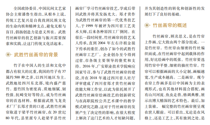 武胜竹丝画帘制作精湛,是川东北地区民间工艺美术的瑰宝。武胜竹丝画帘取道梁平竹丝画帘,制作程序复杂,在郑才贵、许祖金等民间工艺美术大师的带领下走出了自己的发展道路。 2018年,广安职业技术学院的参与为武胜竹丝画帘的技艺创新与传承带来新的机遇。