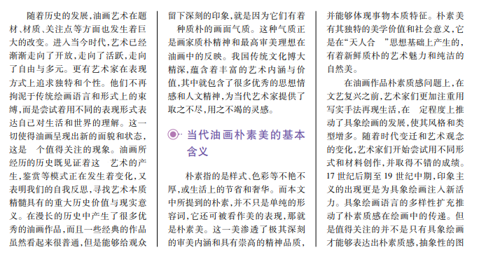在油画创作中,画家要拥有淳朴、真挚的精神品质,在生活中找到简单但非凡的艺术美。现如今,各国间经济、文化的持续交流推动了社会的巨大变革,艺术的发展更加开放和多元。更多的画家渐渐意识到绘画艺术中朴素美的重要性。中国传统绘画是世界上独一无二的艺术瑰宝,具有丰富的文化底蕴和深厚的人文内涵,有着独特的美学价值。