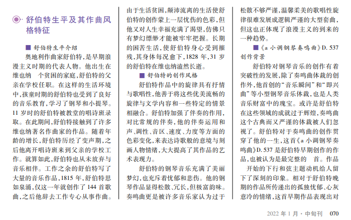《a小调钢琴奏鸣曲》 D.537属于舒伯特的早期作品,舒伯特在此时期所创作的奏鸣曲与古典主义时期的奏鸣曲有着不可分割的关系,但又在不断尝试、探索属于自己的独特风格。作品 D.537一共有三个乐章,第一乐章为奏鸣曲式。对于古典奏鸣曲而言,第一乐章的主题部分往往是整部作品的核心,此乐章不仅饱含舒伯特独特的抒情气质,而且体现了富有歌唱性及欢快的舞曲主题。在演奏时需要注意许多细节,包括力度、速度、踏板、音色等,均须做出精准的分析。
