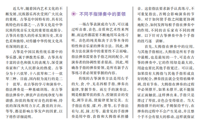 近几年,随着国内艺术文化的不断发展,民族器乐再次受到广大民众的重视。古筝是中国特有的"具有民族特色的乐器之一,古筝文化是中华民族传统音乐文化的重要组成部分。古筝具有悠久的传承发展历史,其音色柔和独特!对传播中华传统文化具有深刻的意义。