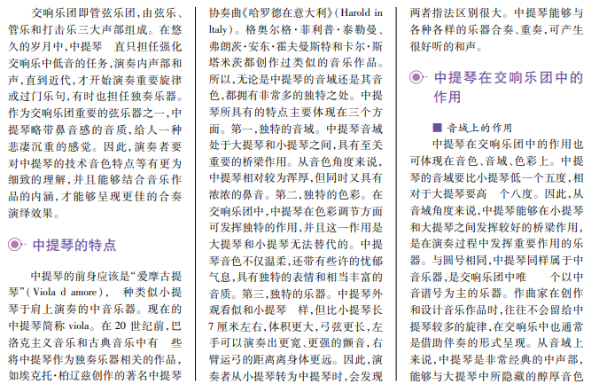 在交响乐中,中提琴因其自身音域的独特魅力,不仅能够承担起复调、和声的作用,还能有效调节演奏的氛围,大大增强音乐作品的感染力和表现力。