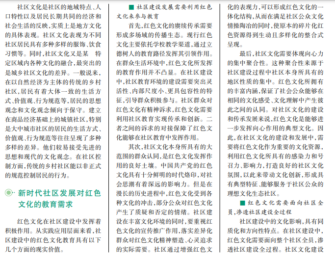 红色文化内涵丰富,具有深远持久的精神影响力。在新时代,需要赓续传承红色文化,发挥其精神影响作用。在众多红色文化中,红色音乐以极强的艺术表现力和文化影响作用震撼人心,具有思想教育、行为塑造的引领作用。在社区建设中,我们应当积极发挥红色文化的精神内核和影响力,利用红色音乐等艺术形态,建构高水平的社区环境。