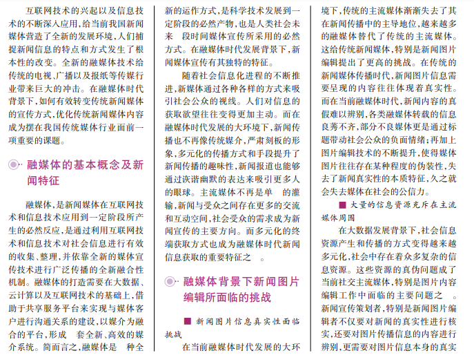 本文通过对融媒体时代基本概念和新闻特征进行阐述,分析融媒体时代背景下新闻图片编辑所面临的挑战、存在的问题以及优势,找寻其优化策略,为全新媒体工作背景下传统新闻媒介的发展和改革找寻可行性发展方向。