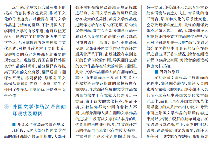 文学作品是人类智慧的结晶,不同国家的文学作品会受到历史、人文、社会等因素的影响。了解外国文学作品是了解西方文学的重要途径,对本土文学素养的提升也有一定裨益。将外国文学作品翻译成中文实际上是文化的转换,也是引进外国文学作品的有效渠道。