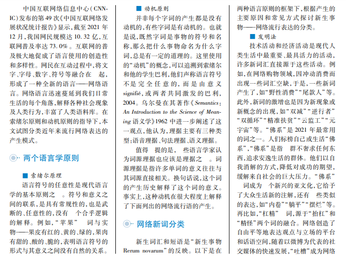 互联网技术的出现极大地丰富了人类语言的形态。因此,研究网络新词对人类语言的发展有着深远的影响。