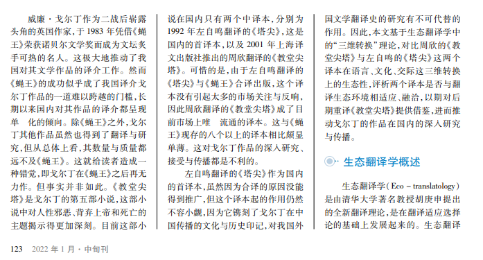 《教堂尖塔》是威廉·戈尔丁一部具有思想重量的作品,这部小说突破了他以往的文学成就,对人性的描写更加深刻、更加发人深省,具有极大的研究价值。目前在国内唯一流通的译本为 2001年由上海译文出版社出版、周欣翻译的《教堂尖塔》,但这并非国内的首译本。早在 1992年,左自鸣翻译的《塔尖》就已经问世。但由于左自鸣翻译的《塔尖》与《蝇王》绑定在一起合译,鲜有人知道这个译本的存在。