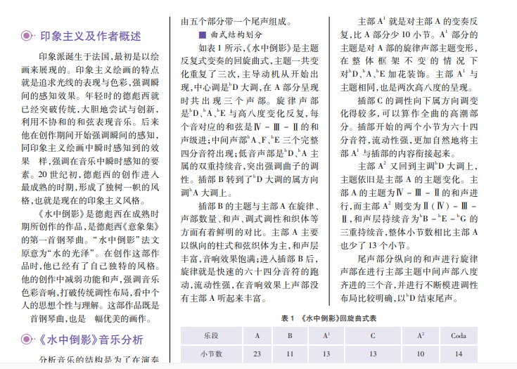 阿希尔·克劳德·德彪西(Achille-ClaudeDebussy,1862—1918),法国作曲家、音乐评论家,在 30余年的创作生涯里,形成了一种被称为“印象主义”的音乐风格,是印象主义音乐最主要的代表人物。德彪西的创作对欧美各国的音乐产生了深远的影响。印象派的美术风格对中国美术发展中的油画有非常大的影响,而德彪西的创作为 20世纪以后出现的音乐打下了坚实的基础。印象主义的音乐如同印象派绘画一样追求音乐的色彩与瞬时感知,将和声等创作手法运用其中。本文即从音乐结构入手,分析德彪西《水中倒影》曲式结构,并简要阐述音乐材料、调式调性以及音阶特点。