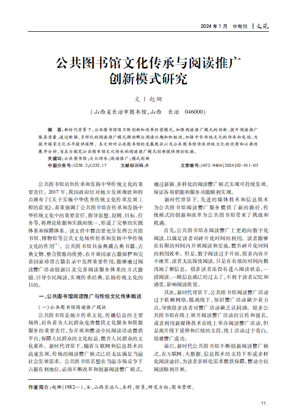新时代背景下,公共图书馆须不断创新和改革经营模式,加强阅读推广模式的创新、提升阅读推广服务质量,通过新颖、多样化的阅读推广模式调动群众阅读兴趣和积极性,加强中华传统文化的传承和发扬,为提升国家文化水平提供保障。本文针对公共图书馆的发展现状以及公共图书馆传承传统文化的优势和必要性展开分析,旨在为探究公共图书馆文化传承的阅读推广模式创新提供理论依据。