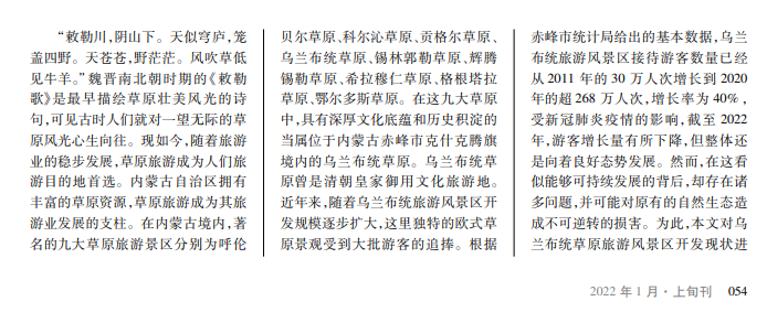 乌兰布统草原风景区作为赤峰市克什克腾旗知名的旅游景点之一,对赤峰市的旅游业发展有着至关重要的作用。然而,近几年由于多种因素的影响,乌兰布统景区草原对赤峰市旅游业发展的带动效果并不理想。本文以此为契机,深入剖析乌兰布统景区草原旅游开发现状及存在的不足之处,并提出可行性对策建议。