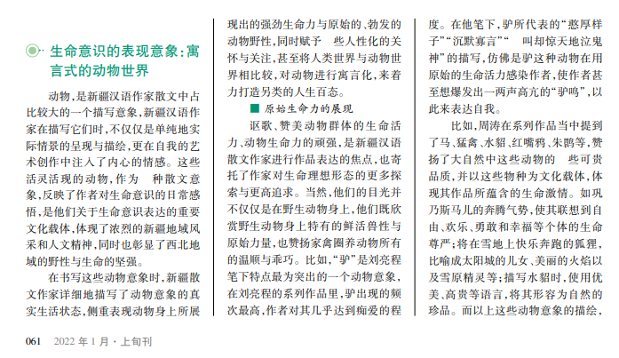 20世纪 90年代以来,在新疆汉语作家散文中,逐渐突出生命意识。以周涛、刘亮程、李娟为代表的新疆作家群体,着重对新疆地域种种动物意象的描绘。这些动物意象的集中呈现往往寄托着作者的心灵体验以及作者对生命的感悟,是作家内心情感的表达,也是他们精神意蕴的重要载体。