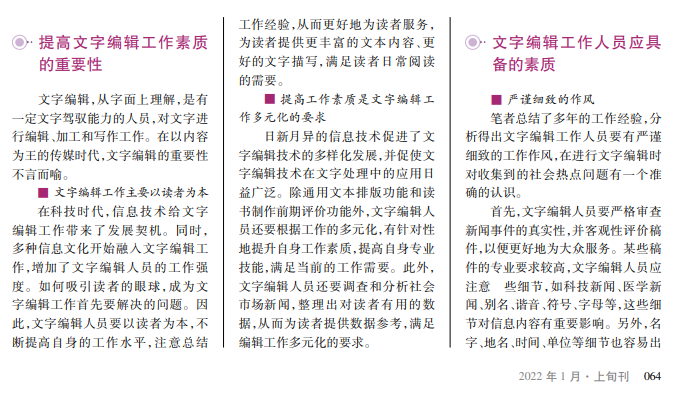 现代信息技术的发展给传统稿件文字编辑的工作方式带来重要影响。文字编辑工作人员要不断提高自身素质,以适应当今社会发展的需要,使编辑工作能够持续、顺利地发展。由于传统稿件文字内容笼统、缺乏新闻场景、新闻元素不全等,文字编辑人员应提高自身素质,为发展新闻事业、寻求新闻生存与发展机遇而不断努力。