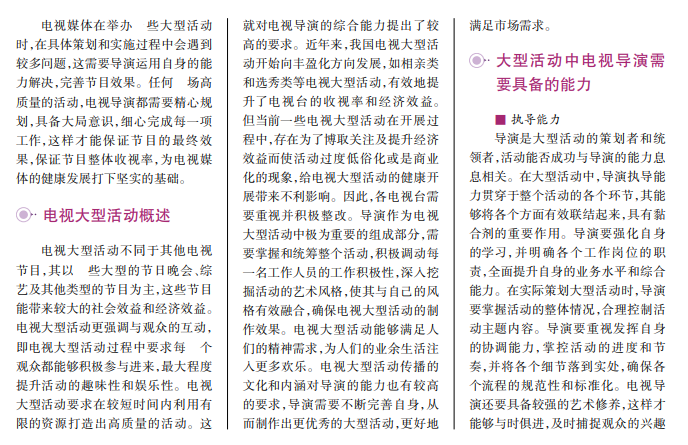 大型活动通常指盛大的节日晚会、大型综艺及各种类型的节目,电视台举办大型活动能够带来较好的经济效益和社会效益。但大型活动的举办对导演的能力具有较高的要求。电视导演在大型活动中需要具备良好的协调能力及专业的职业素养,同时还要具备深厚的文化底蕴,这样才能合理地规划和统筹,打造优秀的电视节目,提高广播电视媒体的收视率。本文从电视大型活动概述入手,分析了大型活动中电视导演需要具备的能力,并进一步阐述了电视导演确保大型活动成功开展的策略。