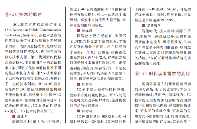进入 5G时代,我们要探索、更新图书馆的服务理念、项目和模式,让图书馆适应新时代的发展。本文从 5G概念和特征入手,探讨 5G时代读者阅读需求的变化以及图书馆发展的策略,将 5G技术与图书馆业务工作有效结合,以期为图书馆的自我变革与深度调整提供一些启发。