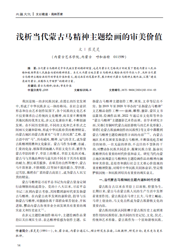 当代蒙古马精神是中华民族宝贵的精神财富,也是内蒙古文艺路线方针政策下塑造内蒙古人民品格和鼓励草原人民振奋向前的精神源泉。本文从内蒙古地区蒙古马精神主题绘画创作作品入手,浅析当代蒙古马精神主题绘画创作的审美价值和意义,透过画家的笔墨世界,展示新时代蒙古马精神主题内涵,汇聚“建设亮丽内蒙古、共圆伟大中国梦”的精神力量。