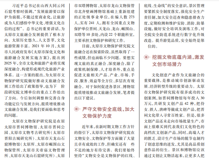 文旅融合是实现旅游业高质量发展的重要途径,是旅游业满足人们多样化、品质化旅游需求的必然选择。目前,太原市文旅融合发展由理念向行动迈出一大步,但在融合创新过程中仍然存在融合深度不够、人才缺失、供需不匹配、文创产品供给同质化严重等问题。本文以太原市文物保护研究院为例,围绕人们旅游需求变化和文旅融合发展面临的现实困境,提出促进文化和旅游深度融合发展的实现路径。