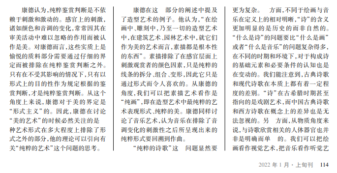 康德在有关纯粹鉴赏判断的论述中提到,素描在造型艺术中具有根本性的地位。素描并不是通过感觉而是纯粹以其形式使人愉悦。这一部分可以导向有关“艺术的纯粹性”的思考。相比于绘画和音乐,“纯粹的诗歌”(以下简称“纯诗”)这一问题更为复杂。本文将从声音、图像、语言三个层面来探讨“纯诗” 的理念。