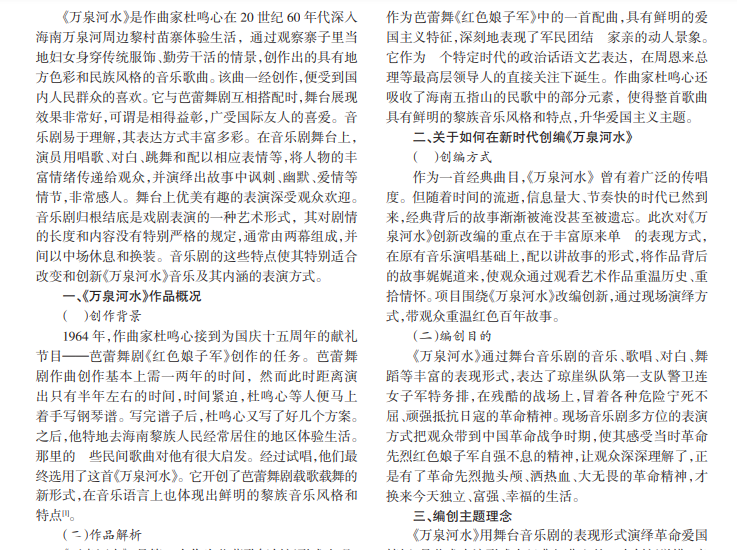 《万泉河水》是中国海南省一首具有浓郁海南当地特色的民族音乐,曲风比较含蓄、抒情,由作曲家杜鸣心初次创作于 1946年,后在 20世纪 70年代初修改后最终定稿。1964年国庆节,《万泉河水清又清》作为芭蕾舞剧《红色娘子军》中的一首配歌为祖国献礼。在新时代的今天,改编创新《万泉河水》,通过乐器演奏、朗诵、舞蹈、演唱等多种方式现场演绎故事,可以带着观众重温红色百年故事,给观众留下深刻印象,激发其浓烈的爱国情怀。同时,可以延续和弘扬红色精神,使观众学习红色历史,重温精神血脉,并在生活和工作中充分发扬红色精神,向观众传递爱国意识,强化爱国理念。
