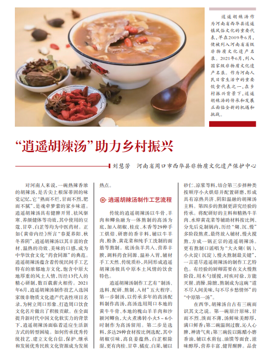 逍遥胡辣汤作 为河南省西华县逍遥 镇风俗文化的重要代 表,早在2009年6月, 便被列入河南省省级 非物质文化遗产名 录。2021年6月,列入 国家级非物质文化遗 产名录。作为河南人 民日常生活中的重要 饮食代表之一,在乡 村振兴背景下,逍遥 胡辣汤的传承和发展 正面临全新的机遇和 挑战。